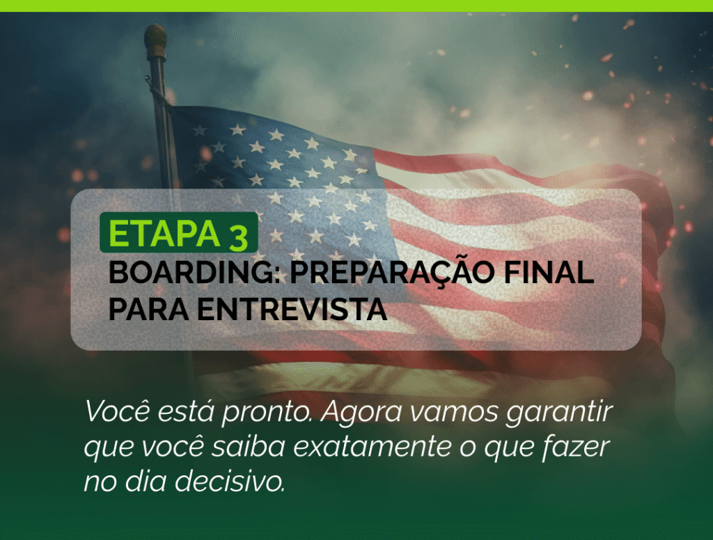 Não é sorte. É preparação estratégica. O método em 3 etapas que elimina a insegurança, aumenta suas chances de aprovação e coloca você no caminho certo para o visto americano.